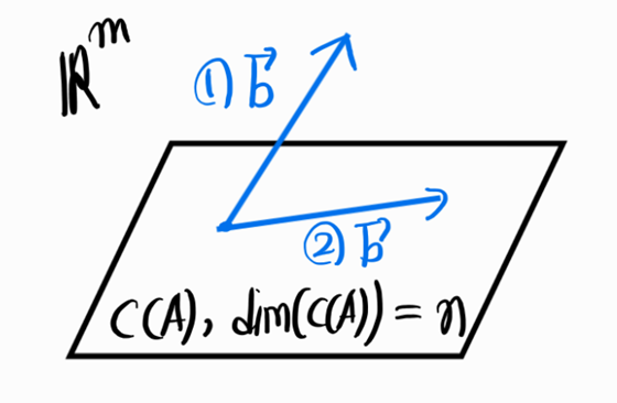 위의 문제에서 A는 full row rank이다. 위해서 한 것처럼 먼저 \(C(A)\)와 \(b\)가 어떻게 위치하고 있을지 파악하고 null space를 따져 완전해를 구하는 것이다. 먼저 \(C(A)\)를 생각해보자. \(C(A)\)는 행렬의 랭크가 m이기에 n개의 (열)벡터 중 선형독립인 column vector는 m개 뿐이다. 따라서 벡터의 span인 열공간은 m차원 벡터공간이다. (n개의 열벡터가 존재하지만,선형종속이기떄문이다.)