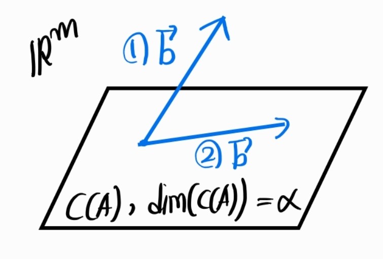 위의 예시에서는 A가 rank deficient인 경우 중, \(m<n\) 인 경우를 생각해보자. 행렬 A의 column space는 m차원 공간의 부분공간이자 \(\alpha\)차원의 벡터공간이다.\(b \in \mathbb{R}^{m \times 1}\)이므로 가능한 경우는 아래와 같다.