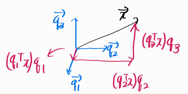 \[\begin{aligned} x = (q_1^Tx)q_1 + (q_2^Tx)q_2 + (q_3^Tx)q_3 = \begin{bmatrix}q_1^Tx \\ q_2^Tx \\ q_3^Tx\end{bmatrix} \end{aligned}\]