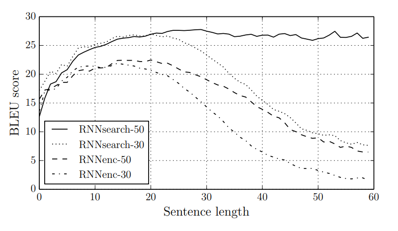 - RNNsearch๊ฐ RNNenc์ ์ฑ๋ฅ๋ณด๋ค ๋์์ ์ ์ ์์ต๋๋ค.(์ฌ์ง์ด RNNenc-50๋ณด๋ค RNNsearch-30์ด ๋ ๋์์.)