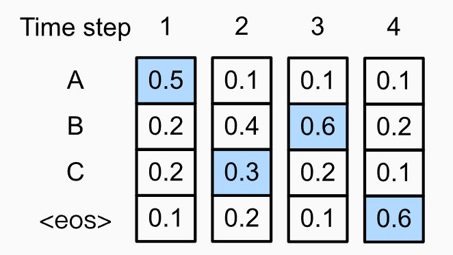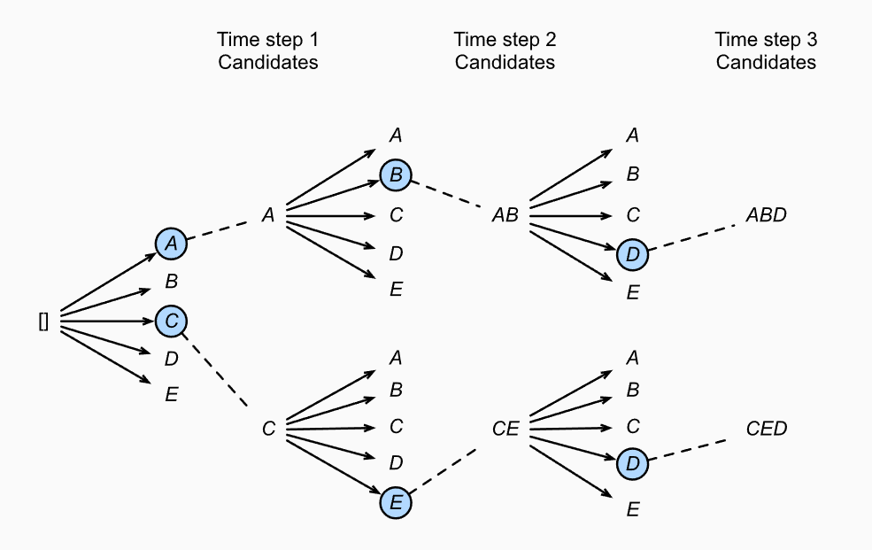 - 각각의 Beam에서 계속해서 conditional probability를 계산하며 Greedy하게 탐색합니다.