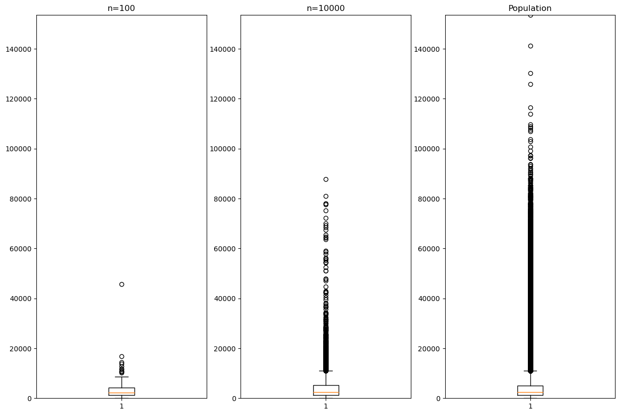 - 크기 10,000인 표본에서 얻은 정보, 즉 상자그림과 요약통계량은 모집단과 매우 유사.
