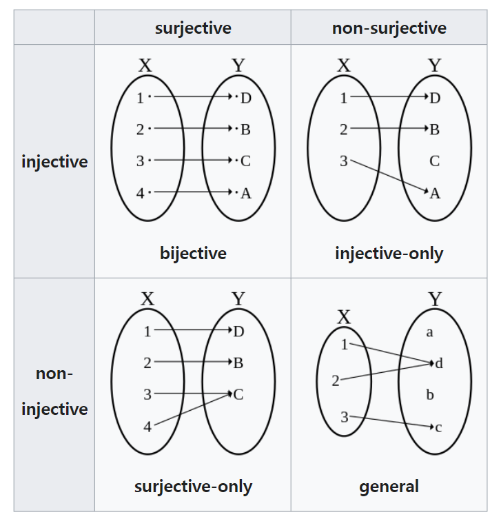 domain에 속하는서로다른 모든 두 원소가codomain에 속하는서로다른 두 원소에mapping될 때Injection function입니다.- 암기(입력이 다르면 출력이 다르다)